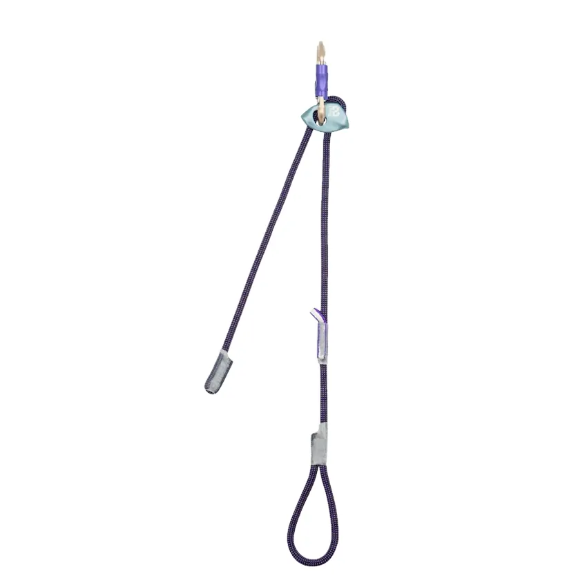 Designed to offer the advantages of an adjustable double lanyard while maintaining the compactness of a single one, it replaces the second strand with a sewn Dyneema loop. This patented design reduces bulk while simplifying handling, particularly when setting up rappels. Attached to the harness via a lark’s head knot in compliance with EN17520 standards, it guarantees both safety and convenience.
