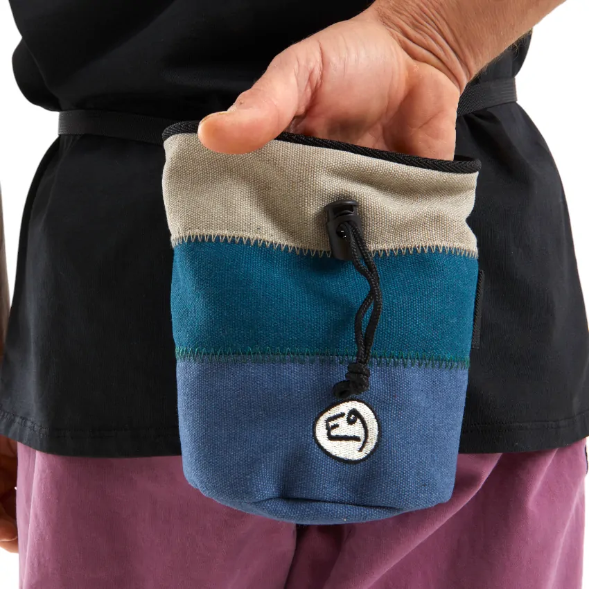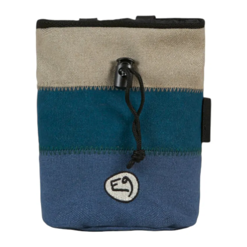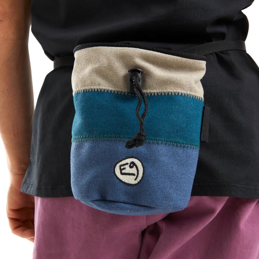 The E9 Rapa is a stylish chalk bag made from 100% organic cotton, offering a soft feel and reliable performance. Its rich texture and playful three-colour design make it a standout accessory on any climb. Designed with climbers in mind, it ensures easy access and secure chalk storage.